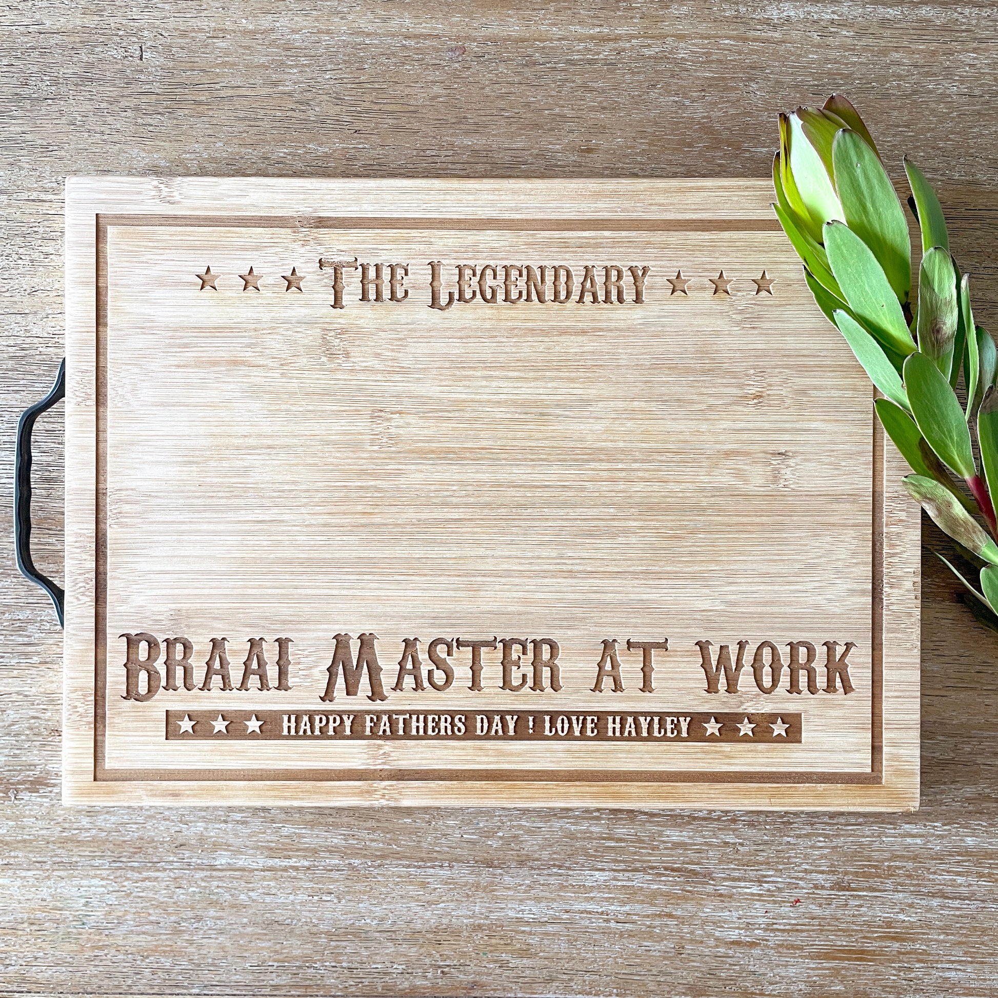 Personalized with any name or sentence at the bottom under "Braai Master at work"