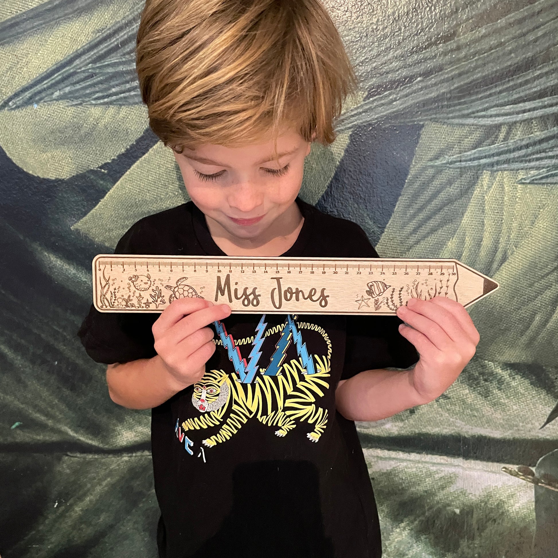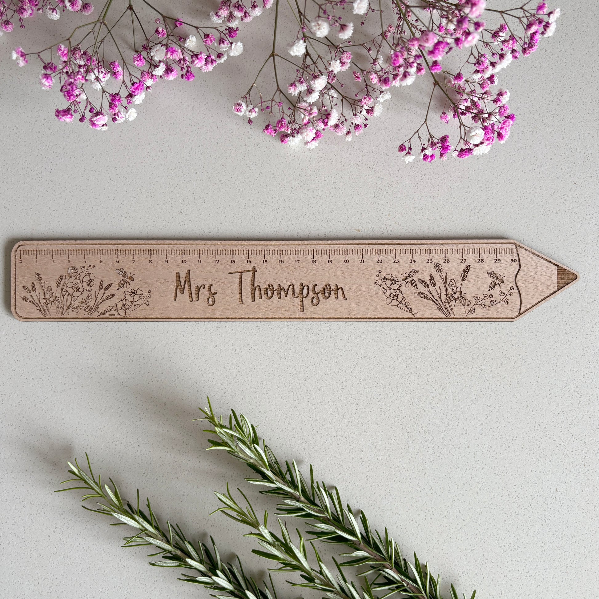 This adorable wooden ruler is personalised with the teachers name and who it is from at the back