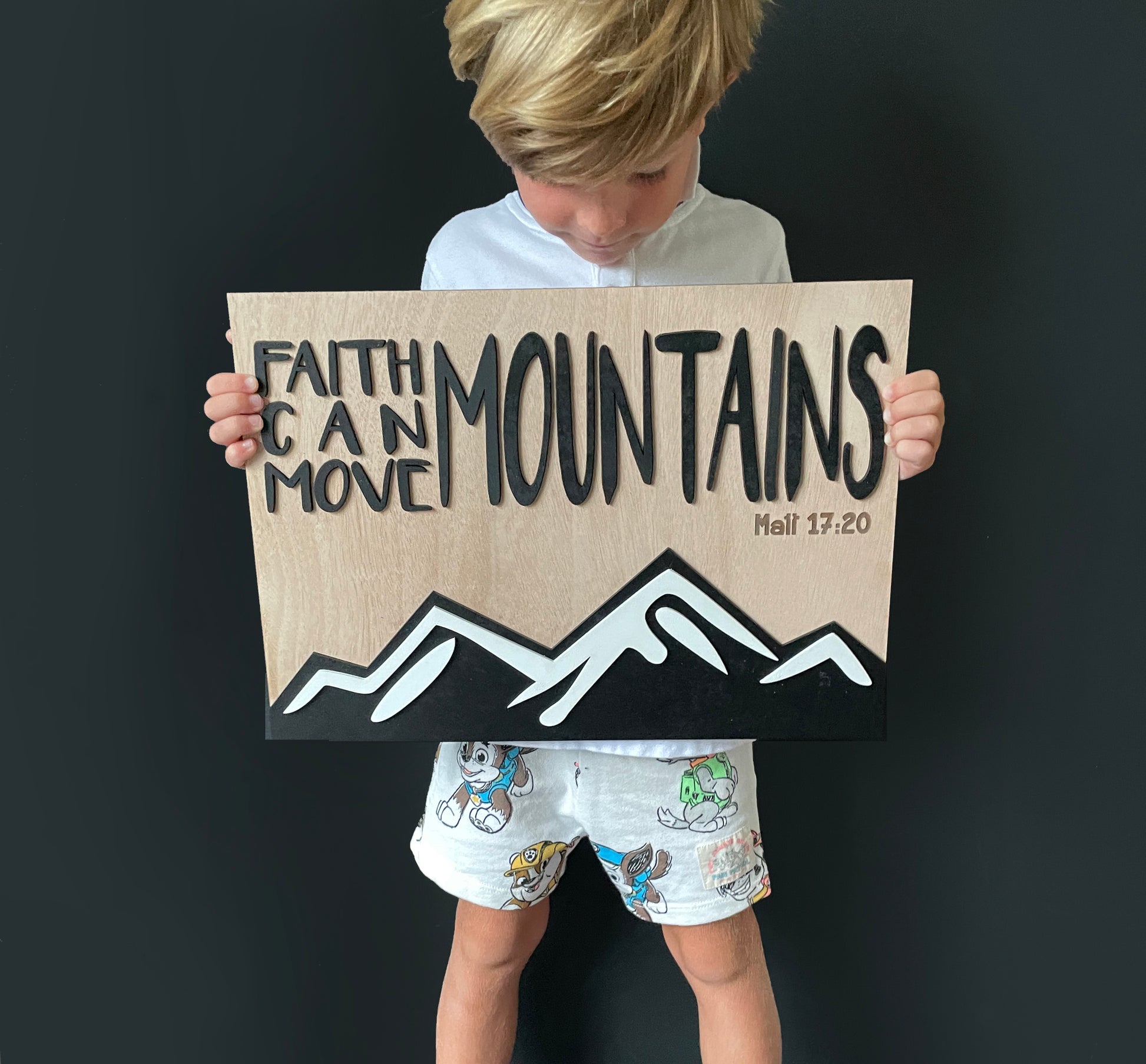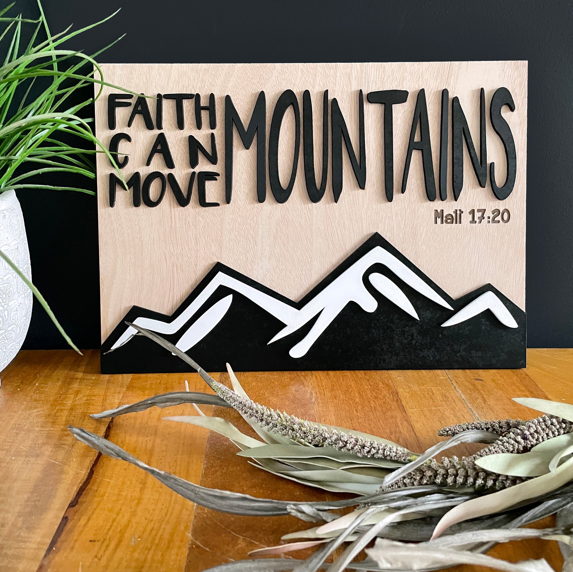 The Faith wall decor comes with black and white on natural wood. Personalized with ann engraved name or verse of your choice underneath the word "mountains"