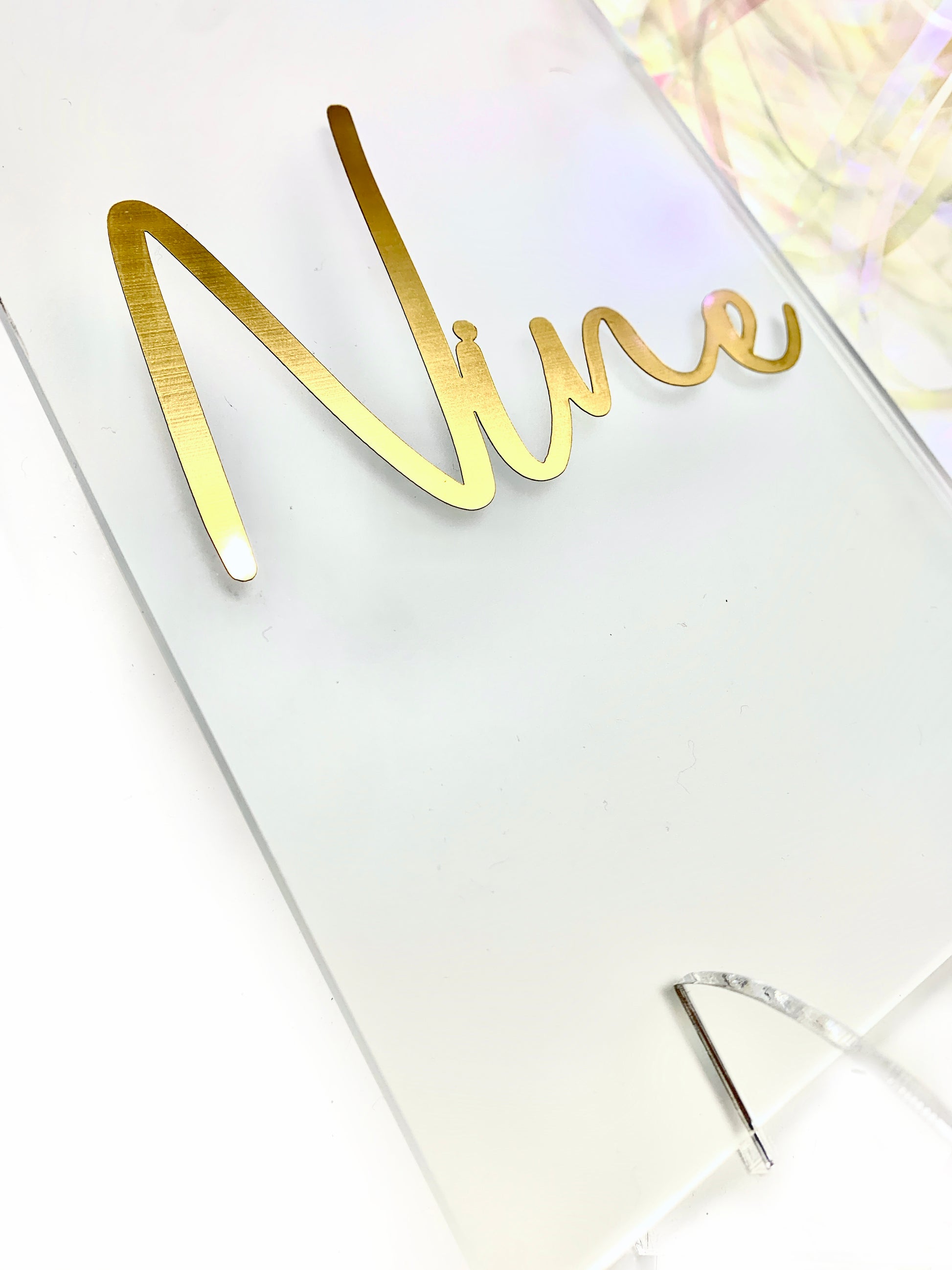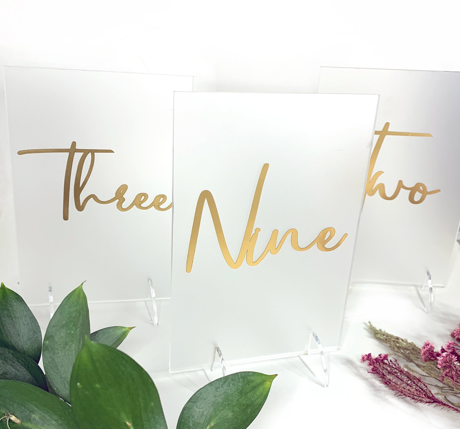 Frosted acrylic table numbers with lasercut gold foil. Elegant and beautiful.