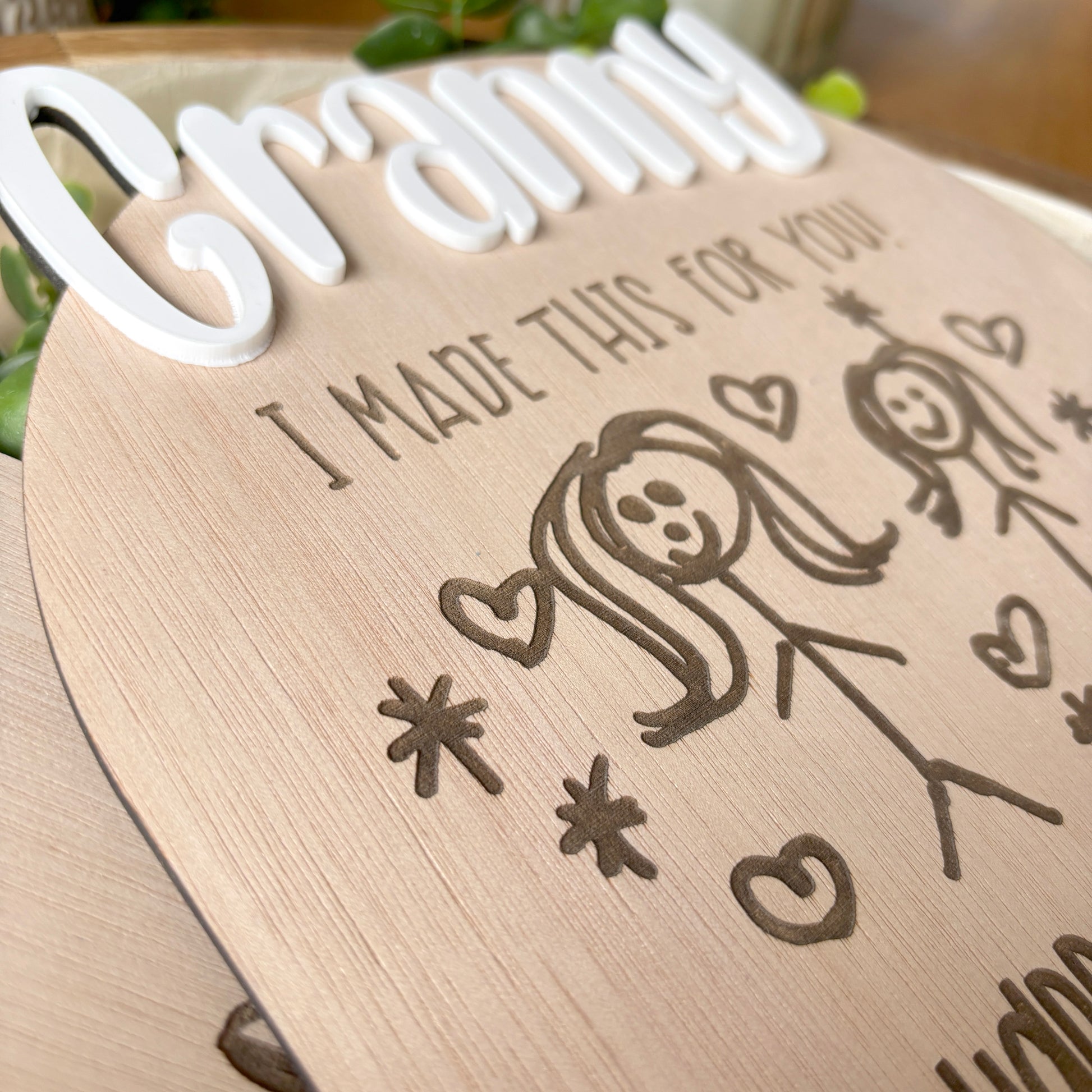 A lovely wooden plaque with children's actual artwork! Or, you can choose to have your little one draw a picture directly onto the wood sign!