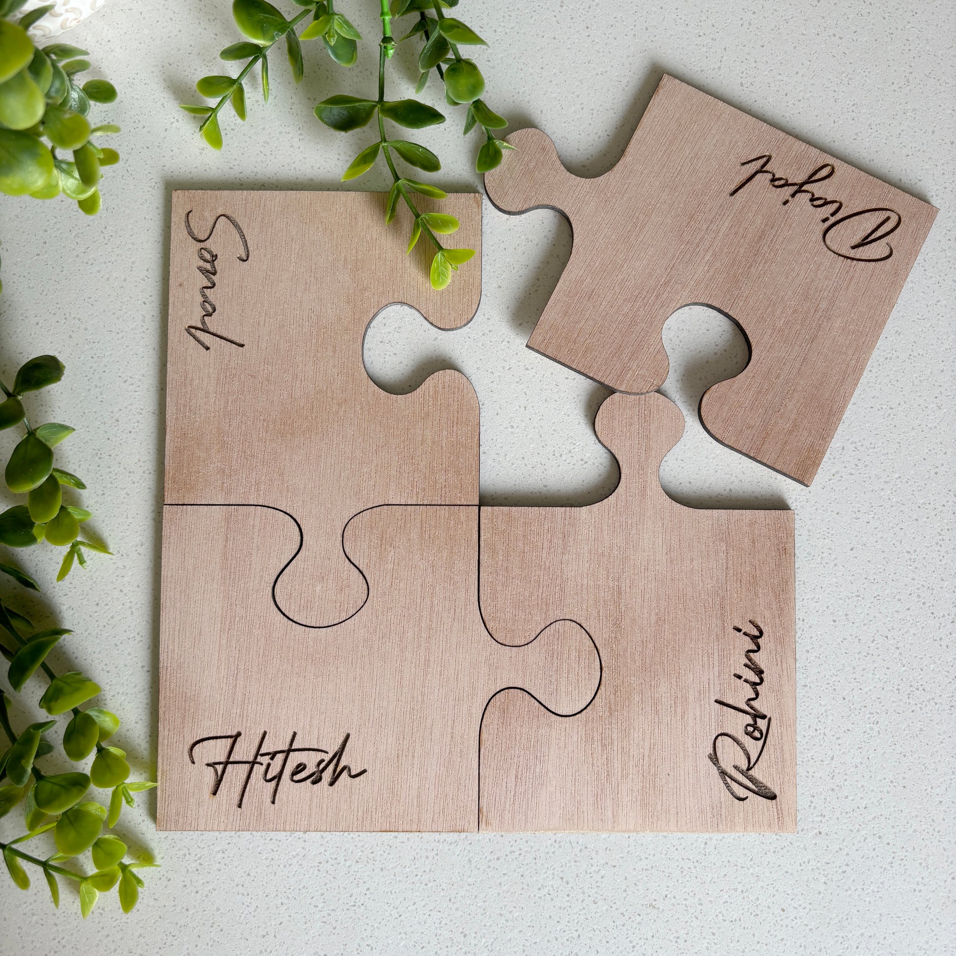Each puzzle coaster is engraved with a name and can be used individually or put together to form a board.