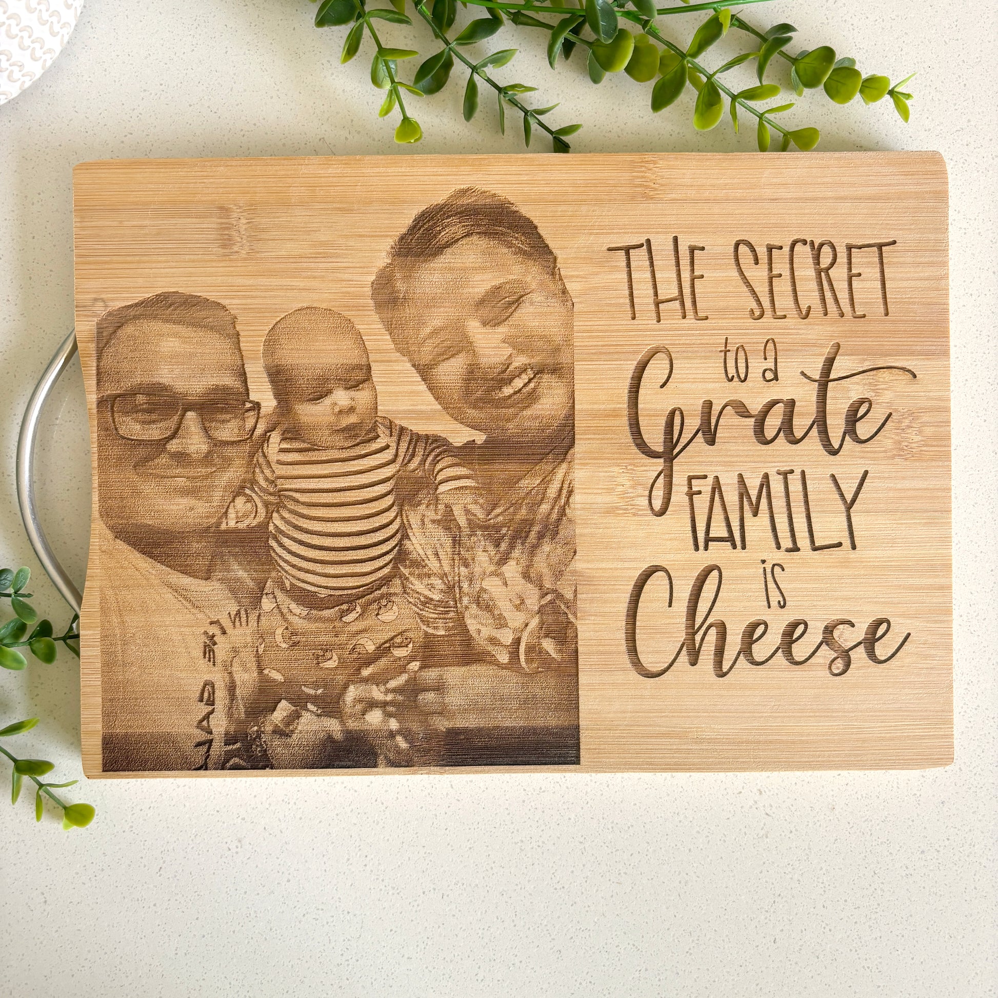 "The secret to a grate family is cheese" photo engraved personalised cutting board