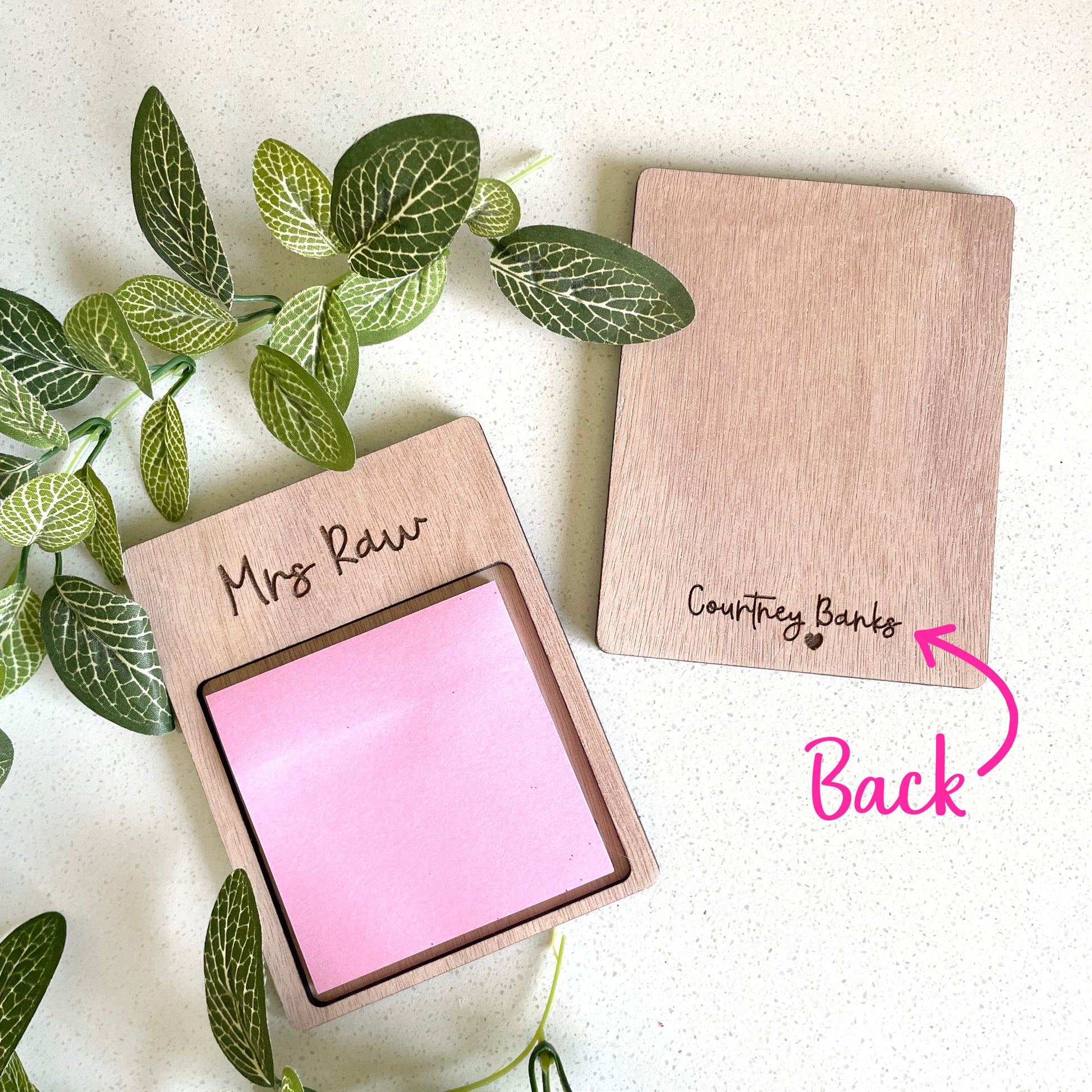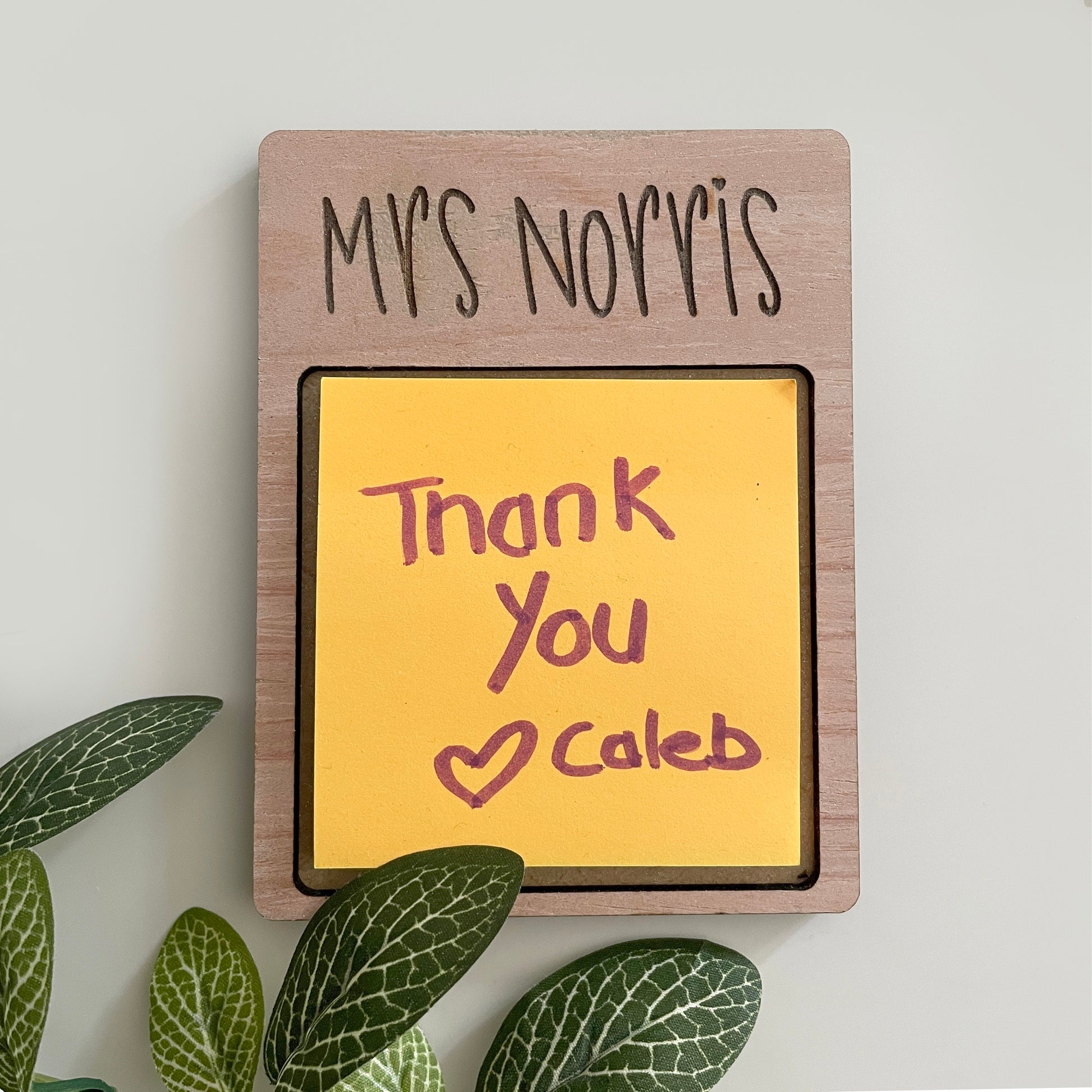 This special gift is personalised and engraved with the teachers name at the top and comes with a 5cm x 5cm post it note pad.