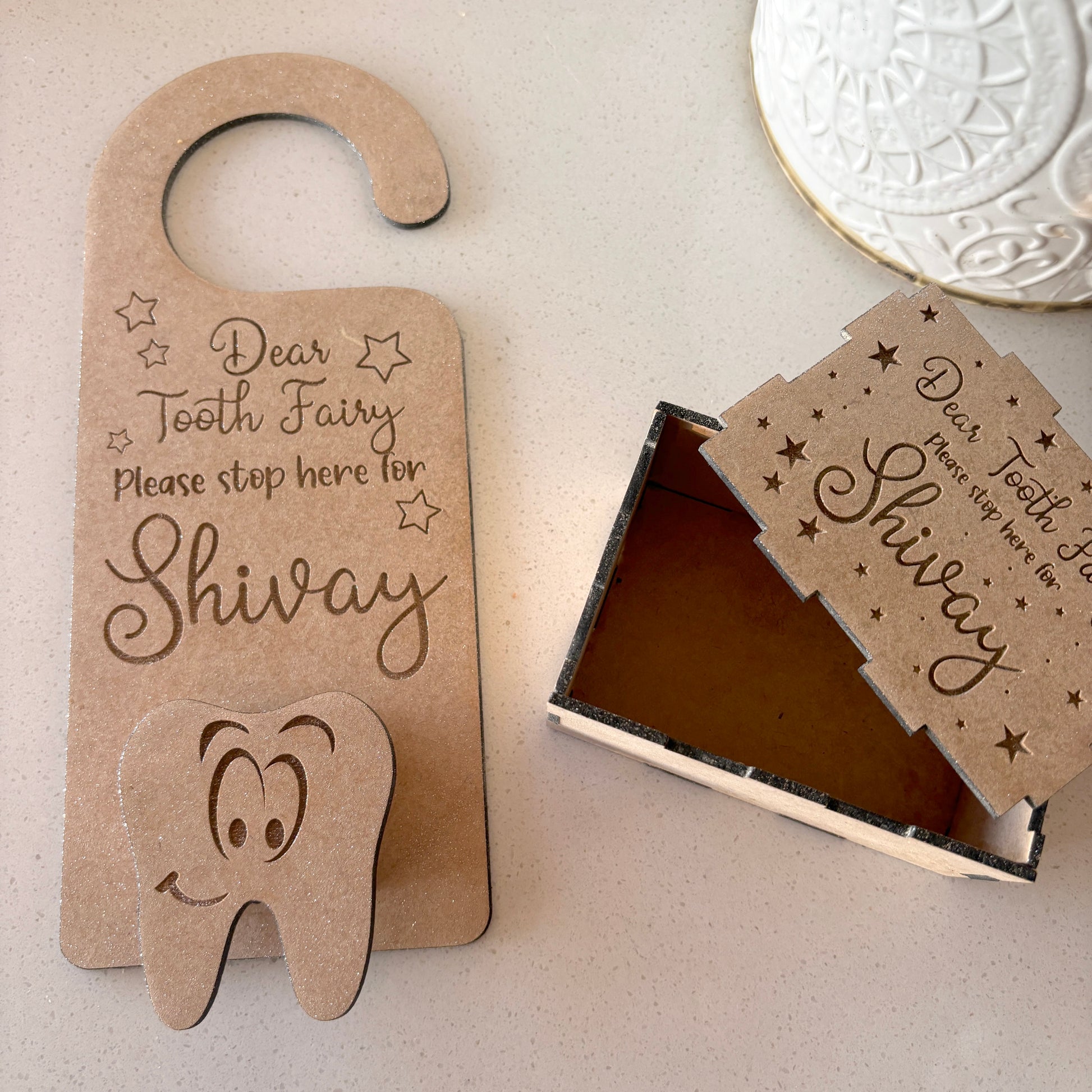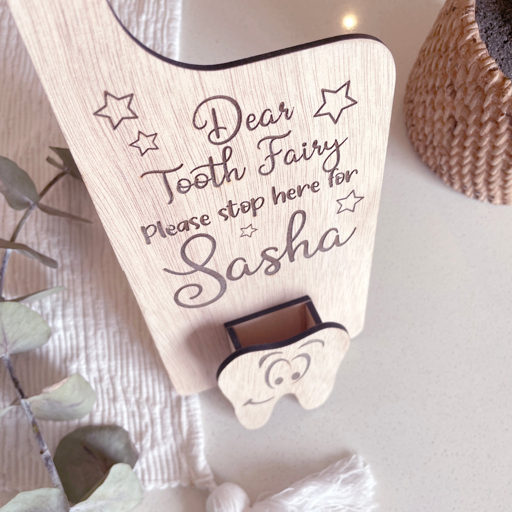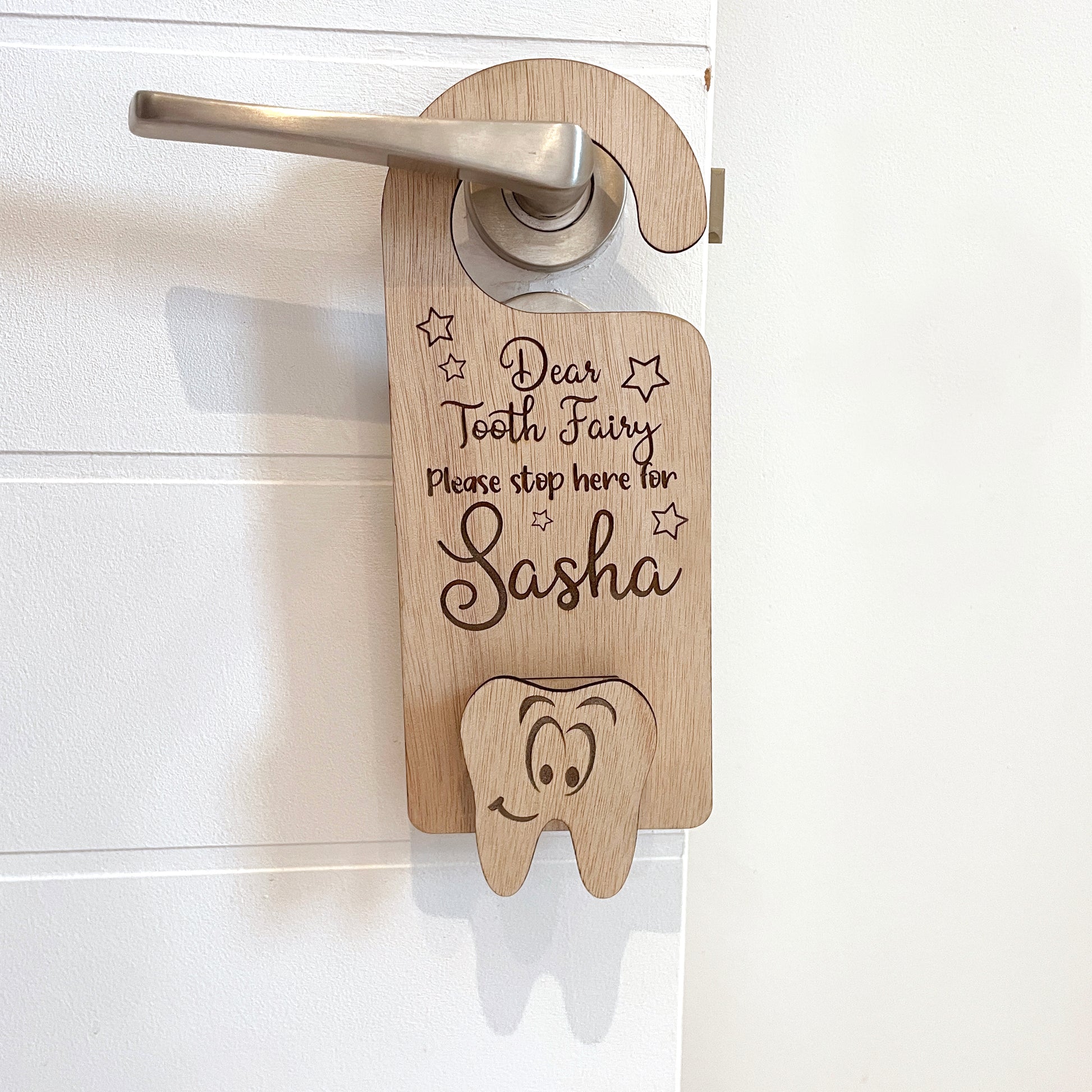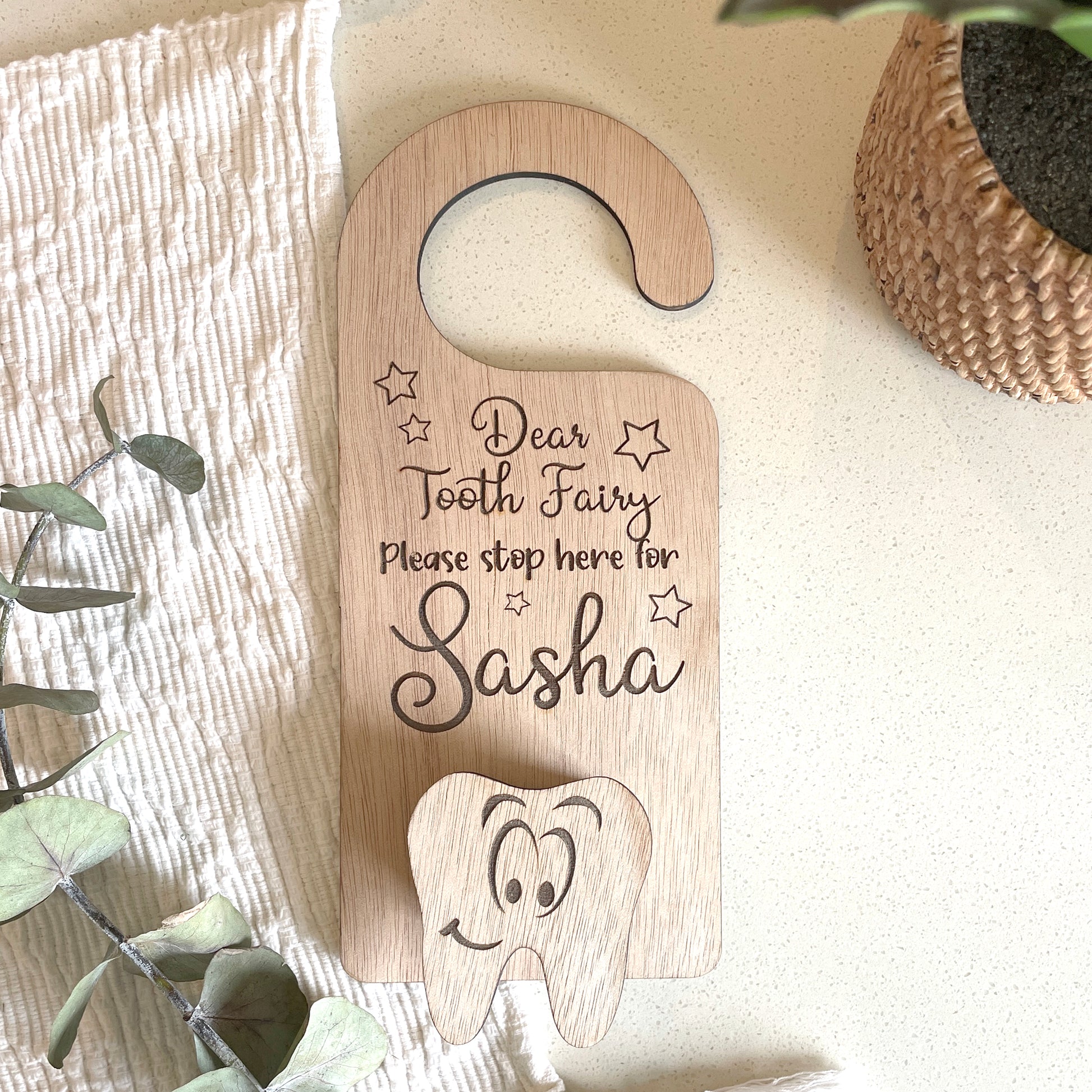 This lovely tooth fairy hanger is personalised with any name and comes with a tooth box at the bottom of the hanger to safely place the tooth in.