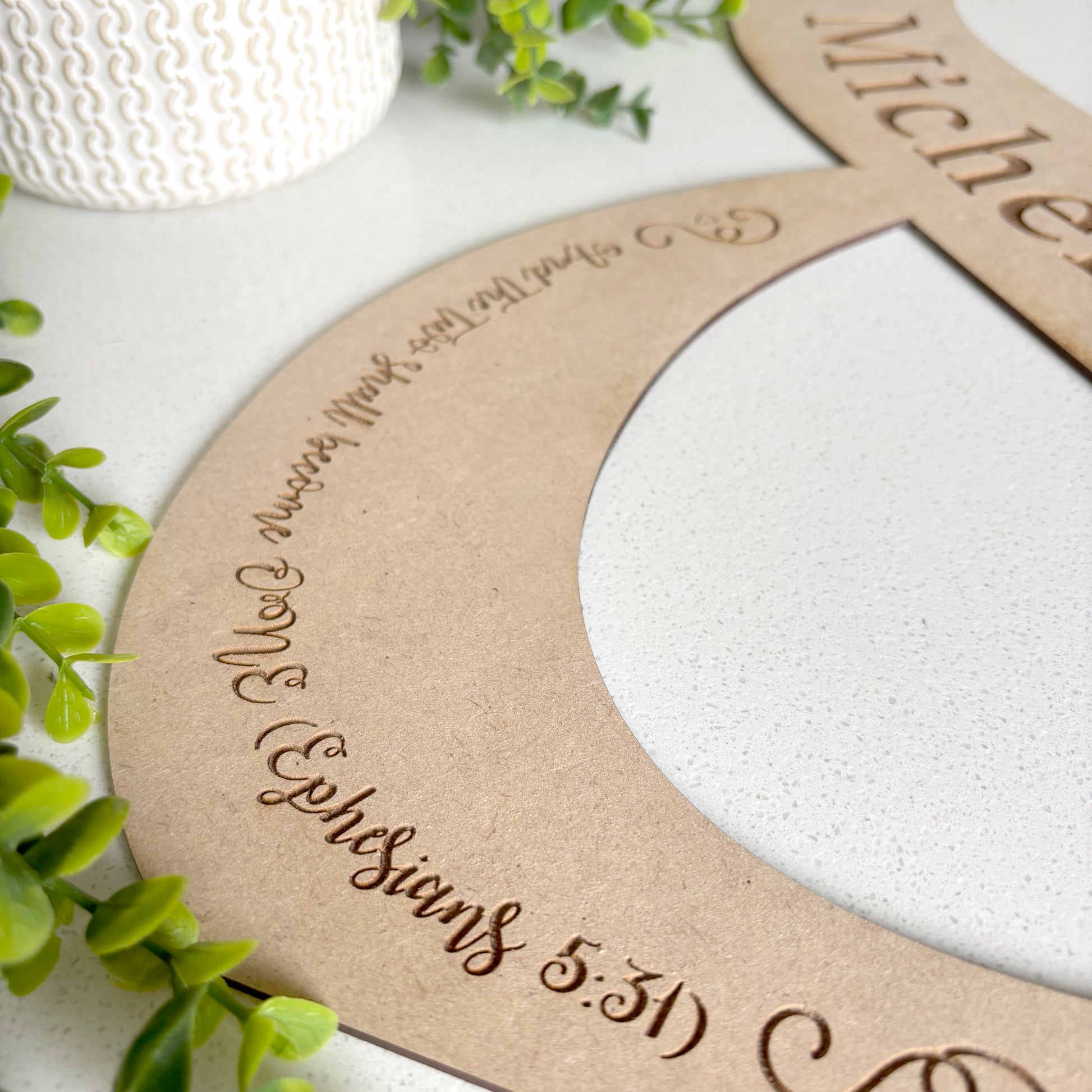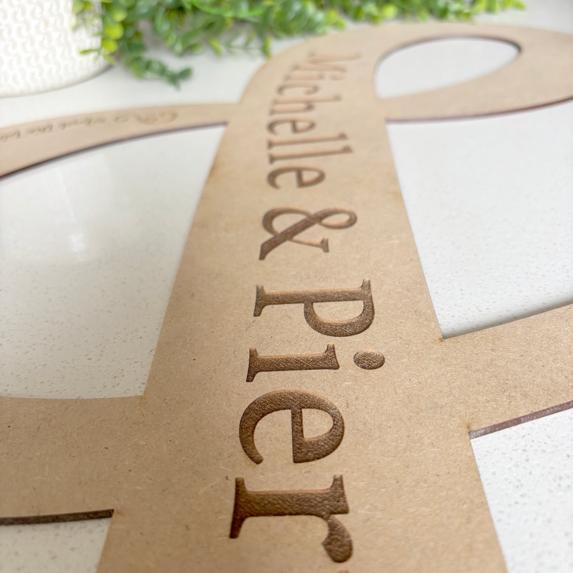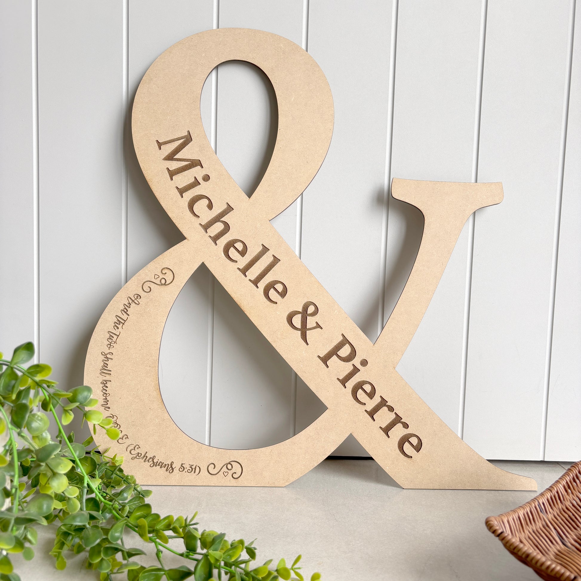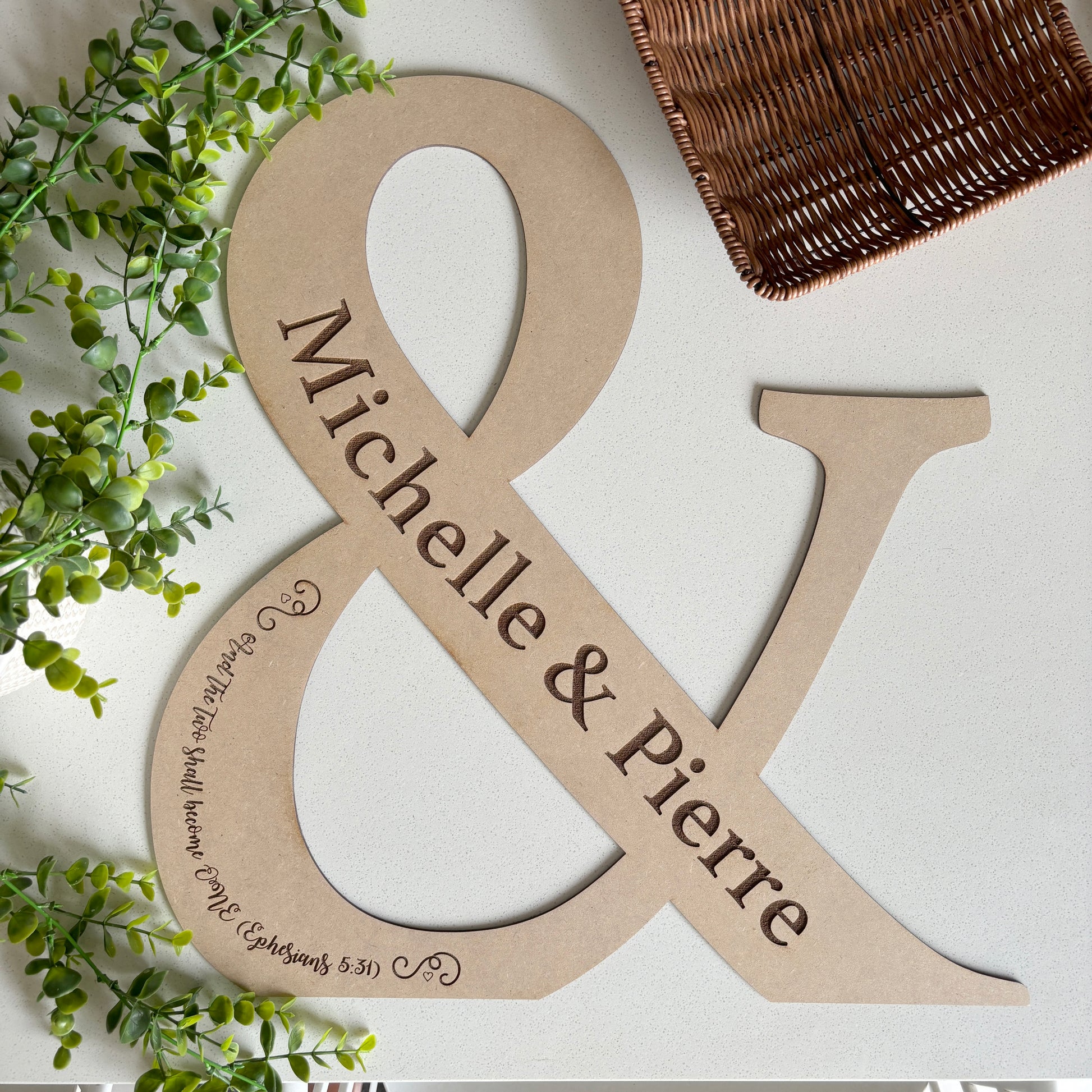 Celebrate your special day with our beautifully lasercut wooden sign, crafted in the elegant shape of "&." Personalize it with your names to create a unique and memorable keepsake for your wedding.