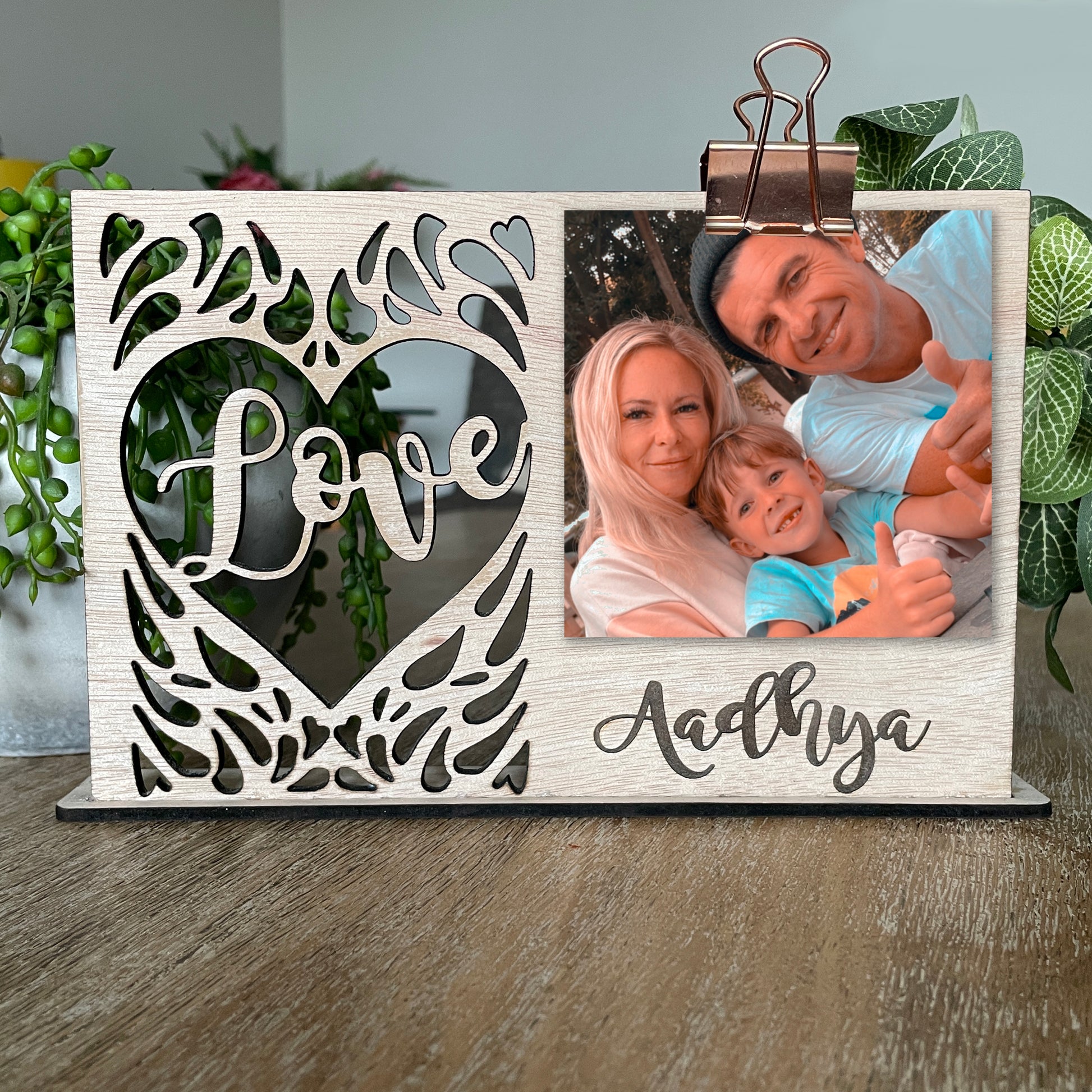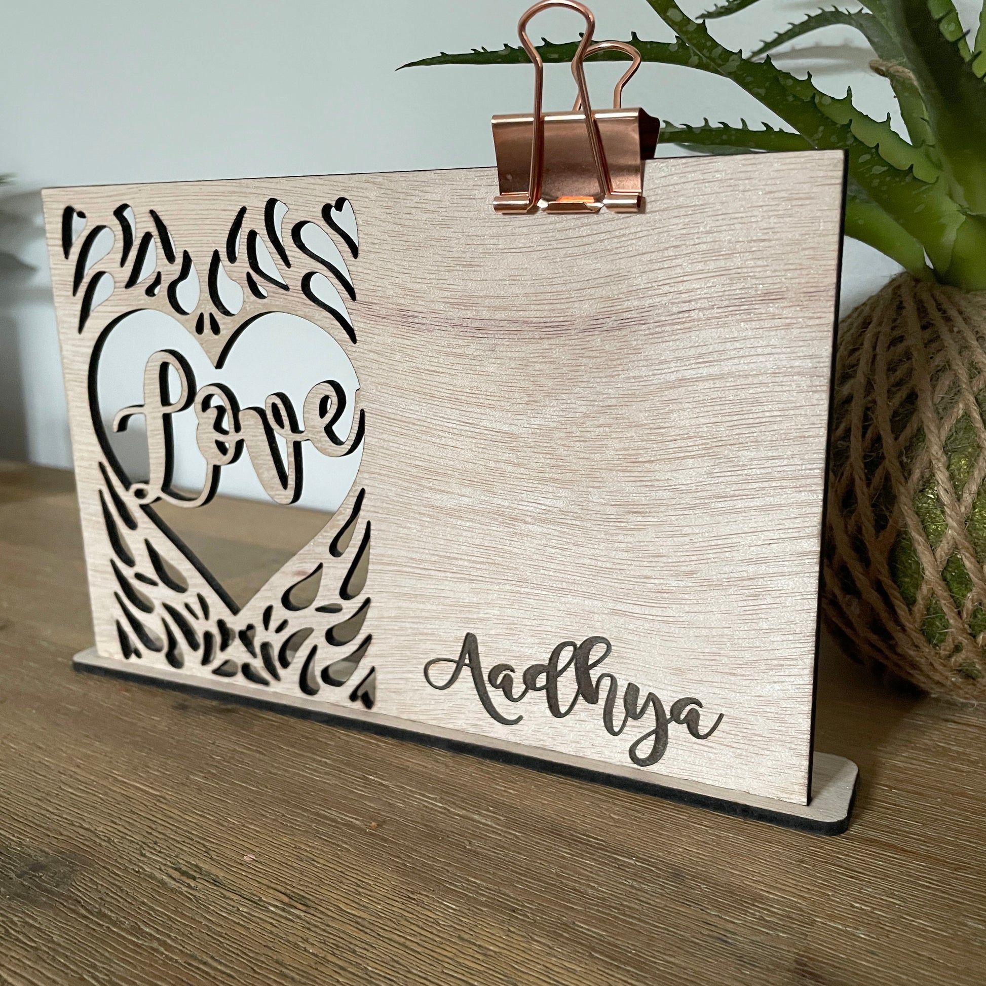 'Love' personalised wooden photo holder engraved