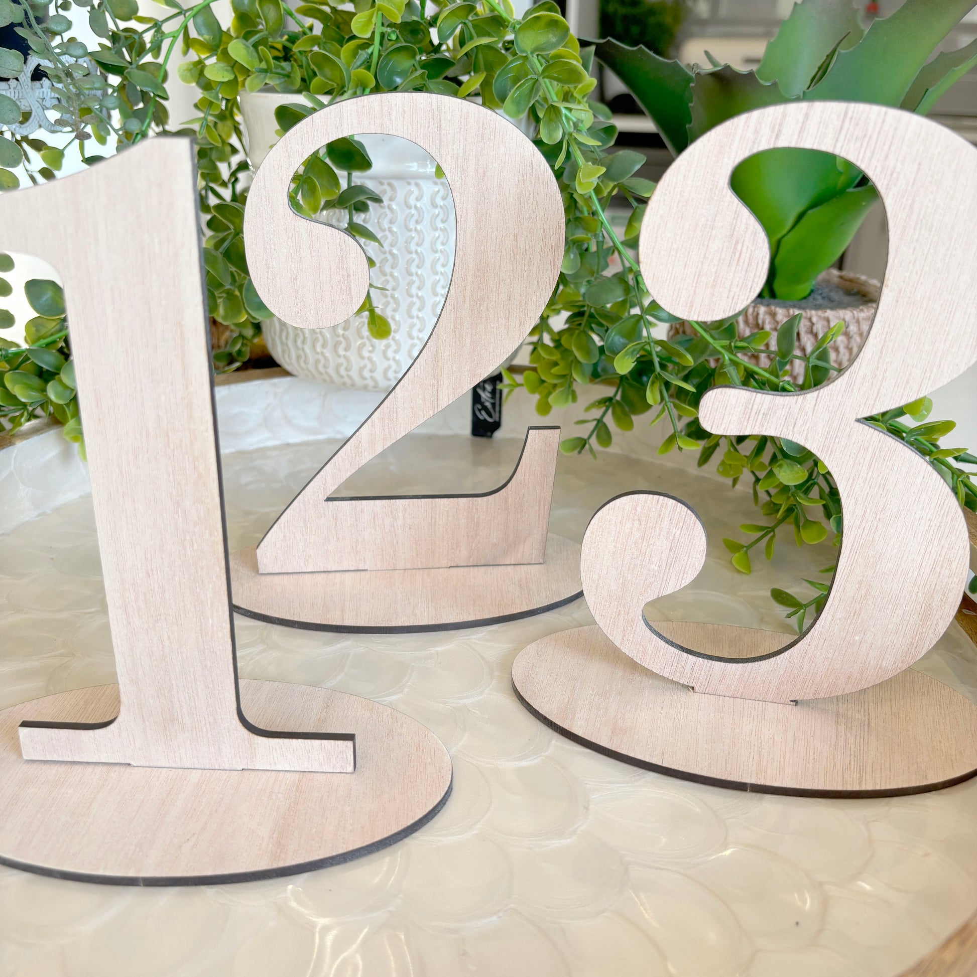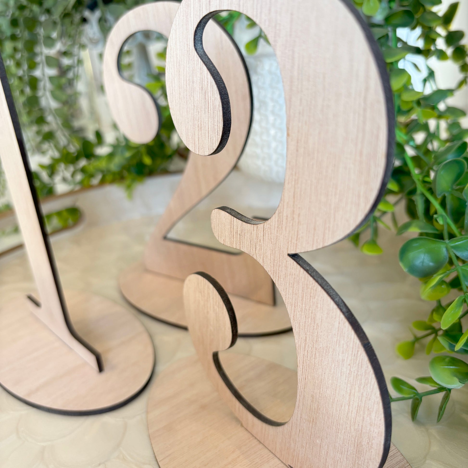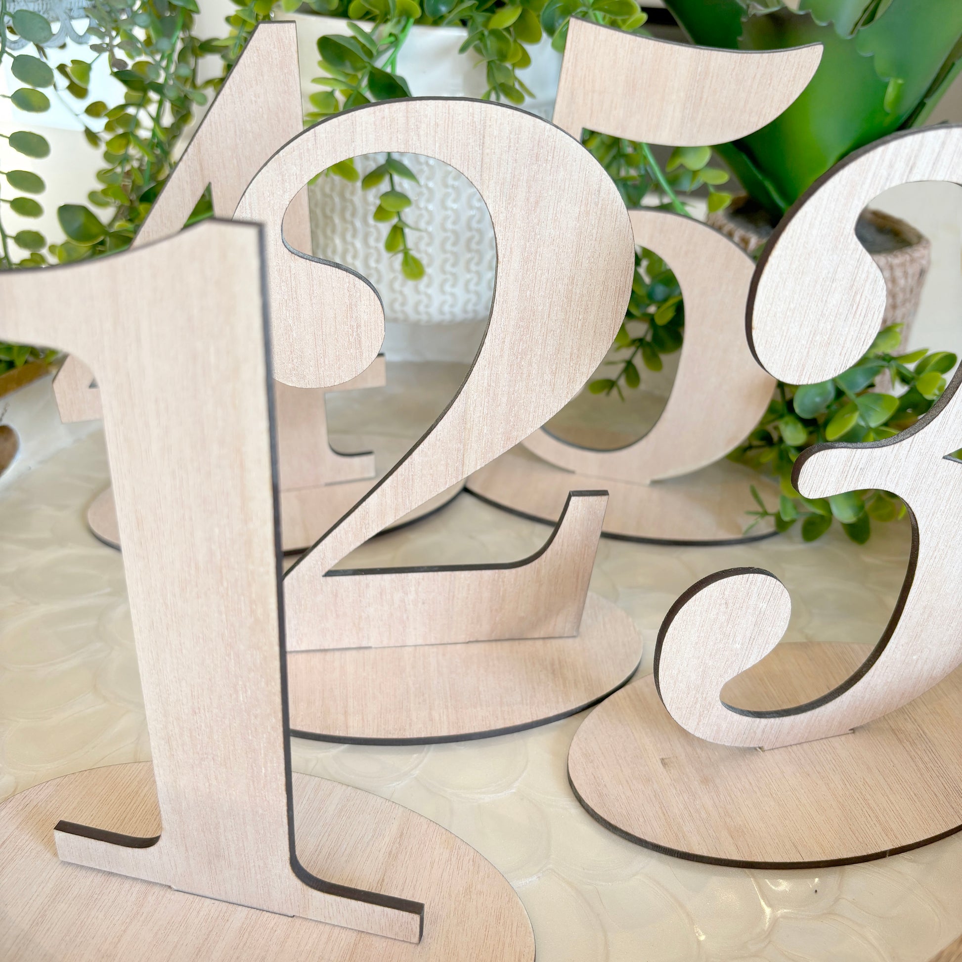 Simple, but elegant table numbers lasercut from wood. Comes with a round base.