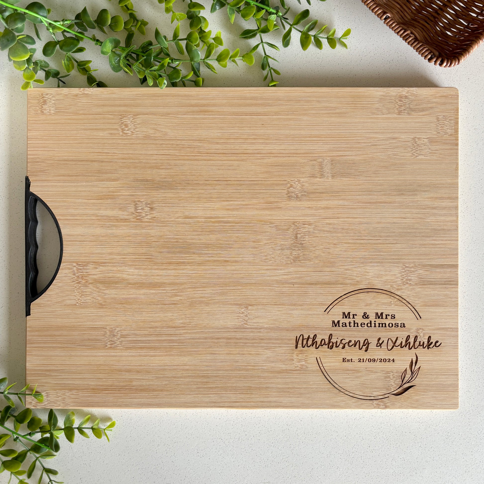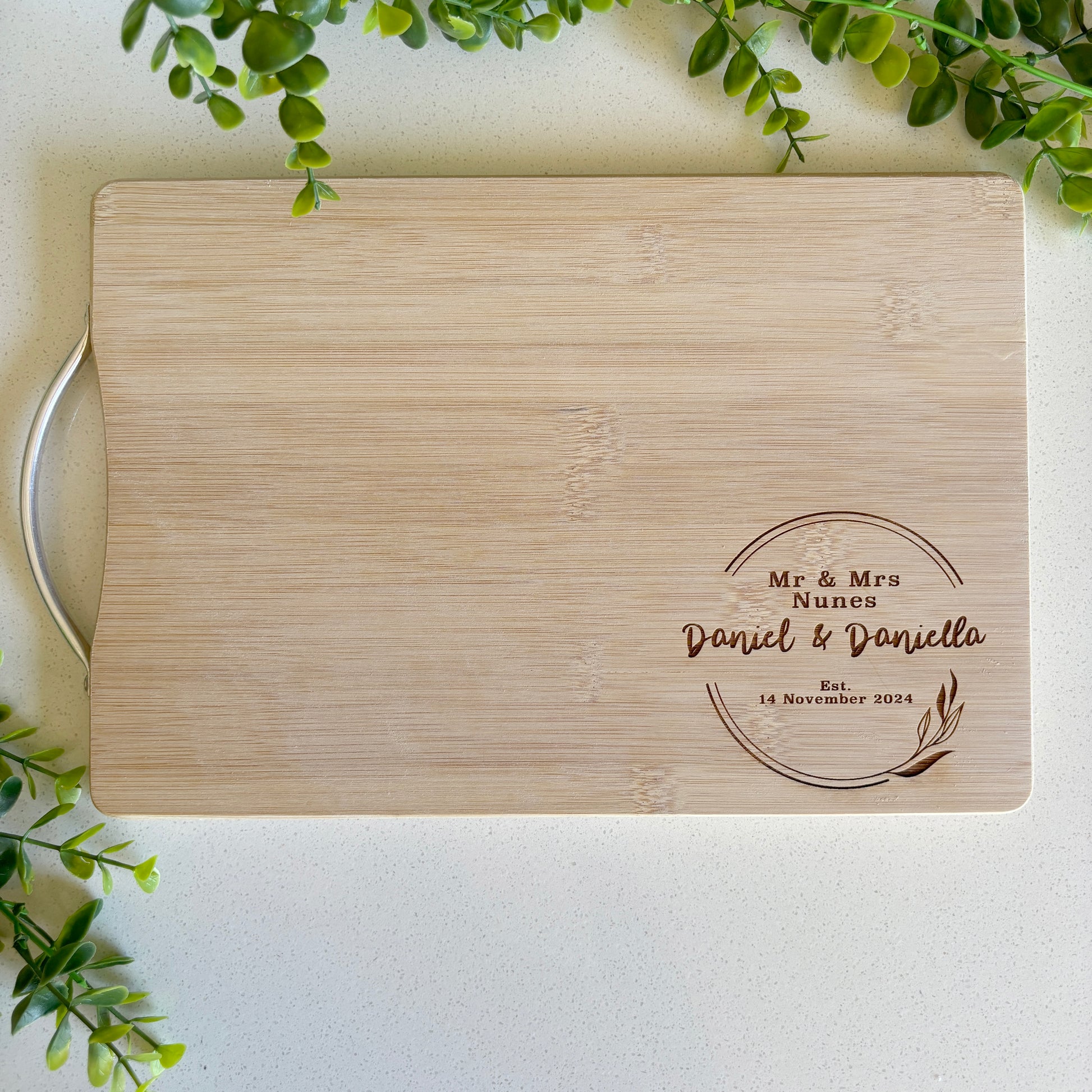 Beautiful bamboo board engraved with an elegant wreath and personalized with: